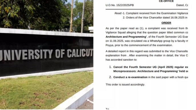 ജൂൺ 11 ന് നടന്ന നാലാം സെമസ്റ്റർ മൈക്രോ പ്രോസസർ, ആർക്കിടെക്ചർ ആൻഡ് പ്രോഗ്രാം പരീക്ഷയുടെചോദ്യ പേപ്പറാണ് ചോർന്നത്.