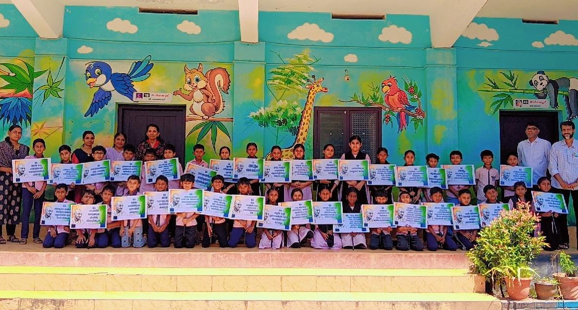 ഗാന്ധി സന്ദേശം എഴുതിയ പ്ലക്കാർഡുകൾ ഉയർത്തി ഭാവി ഭാരതത്തിനായി കുട്ടികൾ ശപഥം പുതുക്കി.