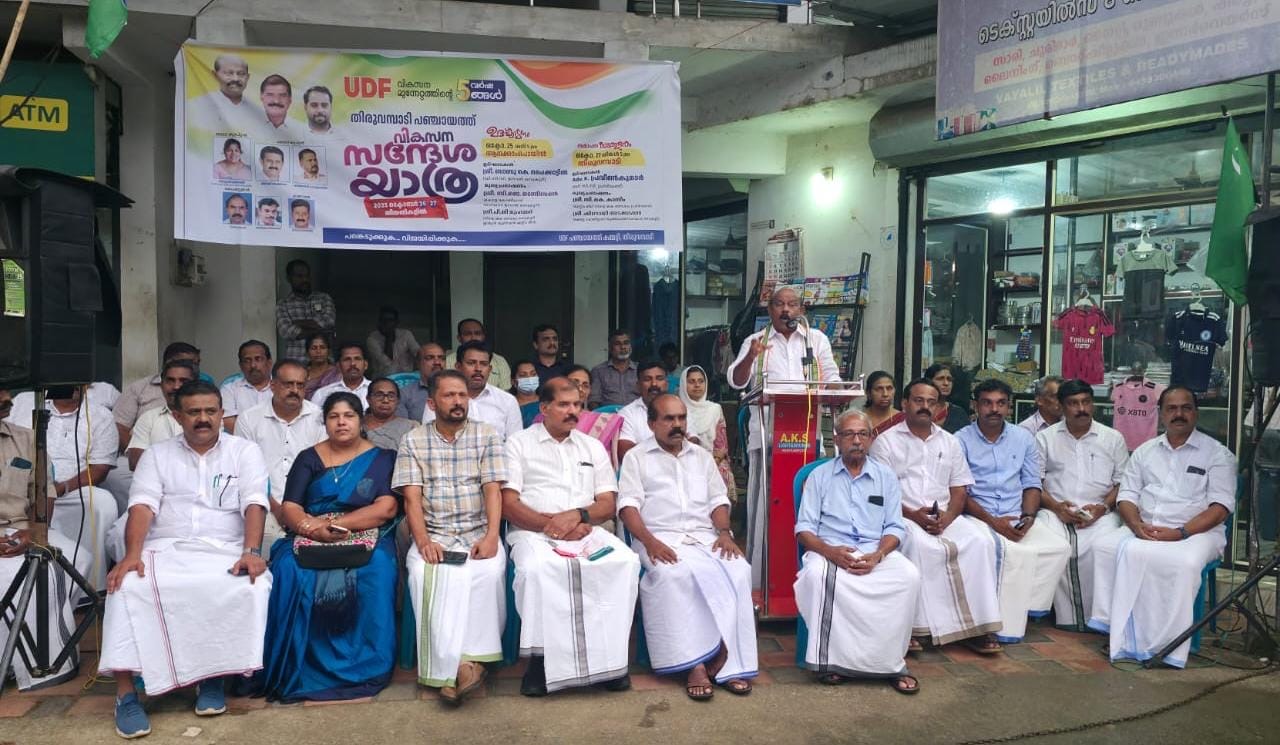 27-10-2025 തിങ്കളാഴ്ച രാവിലെ 9.00 മണിക്ക് മുത്തപ്പൻപുഴയിൽ നിന്നും പ്രയാണം ആരംഭിക്കുന്ന യൂഡിഎഫ് വികസന സന്ദേശ യാത്ര പത്തൊൻപത് വാർഡുകളിലും സ്വീകരണ കേന്ദ്രങ്ങൾ പിന്നിട്ട് വെകു: 5.00 മണിക്ക് തിരുവമ്പാടി ബെസ്റ്റാൻ്റ് പരിസരത്ത് സമാപിക്കും. ഡിസിസി പ്രസിഡൻ്റ് അഡ്വ: കെ പ്രവീൺ കുമാർ ഉദ്ഘടനം ചെയ്യും. മുസ്സിം ലീഗ് തിരുവമ്പാടി നിയോജക മണ്ഡലം പ്രസിഡൻ്റ് സി.കെ കാസിം, കേരളാ കോൺഗ്രസ് യൂത്ത് ഫ്രണ്ട് സംസ്ഥാന സെക്രട്ടറി ഷിനോയി അടക്കാപ്പാറ മുഖ്യപ്രഭാഷണം നടത്തും.