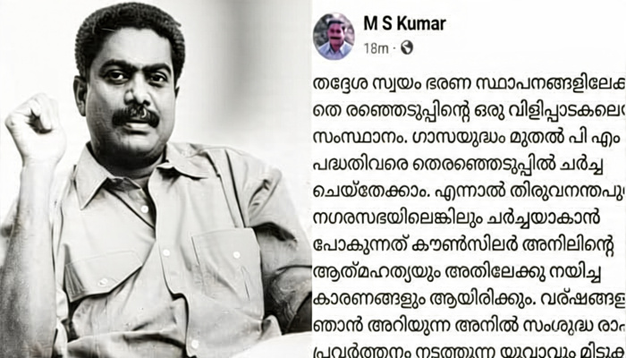 തദ്ദേശ സ്വയം ഭരണ സ്ഥാപനങ്ങളിലേക്കുള്ള തെരഞ്ഞെടുപ്പിന്റെ ഒരു വിളിപ്പാടകലെയാണ് സംസ്ഥാനം. ഗാസയുദ്ധം മുതൽ പി എം ശ്രീ പദ്ധതിവരെ തെരഞ്ഞെടുപ്പിൽ ചർച്ച ചെയ്തേക്കാം. എന്നാൽ തിരുവനന്തപുരം നഗരസഭയിലെങ്കിലും ചർച്ചയാകാൻ പോകുന്നത് കൗൺസിലർ അനിലിന്റെ ആത്മഹത്യയും അതിലേക്കു നയിച്ച കാരണങ്ങളും ആയിരിക്കും. വർഷങ്ങളായി ഞാൻ അറിയുന്ന അനിൽ സംശുദ്ധ രാഷ്ട്രീയ പ്രവർത്തനം നടത്തുന്ന യുവാവും മിടുക്കനായ ജനപ്രതിനിധിയും ആണ്. രാഷ്ട്രീയത്തിൽ ഒരുപാടു ഉയരങ്ങളിൽ എത്തേണ്ട ആ ചെറുപ്പക്കാരന് പാതിവഴിയിൽ ശരീരം ഉപേക്ഷിച്ചു മടങ്ങേണ്ടി വന്നത് അദ്ദേഹം ഒരു സഹകരണ പ്രസ്ഥാനത്തിന്റെ ഭാഗം ആയിപോയതുകൊണ്ടാണ്.