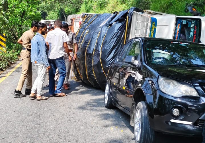 ചുരത്തിൽ മറിഞ്ഞ പിക്കപ്പ് നിവർത്തി; ഗതാഗത തടസ്സം തുടരുന്നു