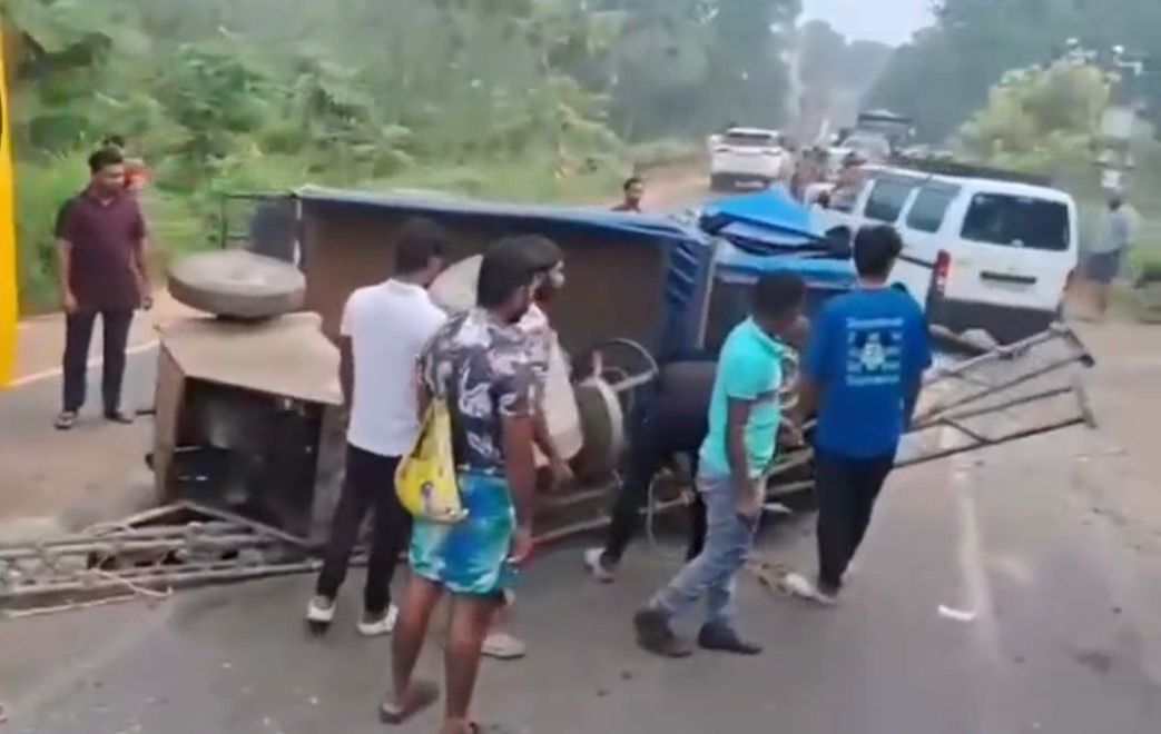 പിക്കപ് ലോറി ഇടിയുടെ ആഘാതത്തിൽ റോഡിൽ മറിഞ്ഞു. അതിഥി തൊഴിലാളികളെ കുത്തിനിറച്ചു കൊണ്ടുപോകുന്നത് പതിവാണ്, ഇത് വലിയ അപകടങ്ങൾക്ക് വഴിയൊരുക്കുന്നുവെന്നാണ് നാട്ടുകാരുടെ പ്രതികരണം.
