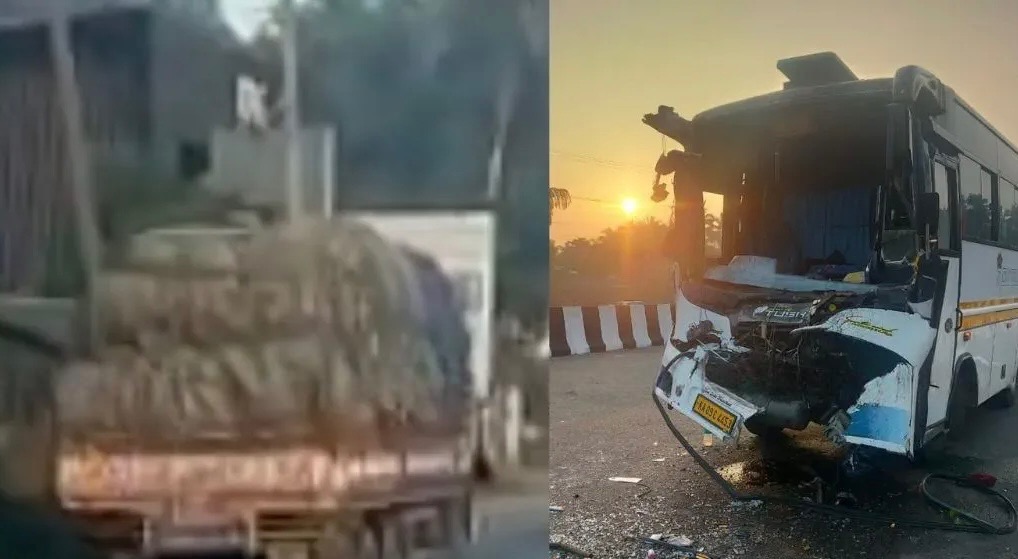 കര്ണാടക രജിസ്റ്ററില് ഉള്ള ബസ്സാണ് അപകടത്തില് പെട്ടത്. ബസ് ലോറിയുടെ പിന്നില് ഇടിക്കുകയായിരുന്നു. ബസ്സിന്റെ മുന്ഭാഗം പൂര്ണ്ണമായും തകര്ന്നു. ചിലരുടെ പരിക്ക് ഗുരുതരമാണെന്നാണ് വിവരം.