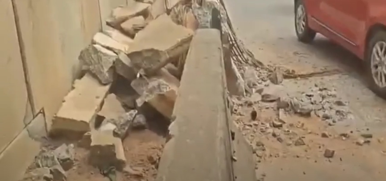 ഒന്നരമീറ്റർ നീളവും വീതിയുമുള്ള കോൺക്രീറ്റ് സ്ലാബുകളാണ് ഇന്റർലോക്ക് രീതിയിൽ അടുക്കിയാണ് മതിൽ നിർമിക്കുന്നത്. ഈ സ്ലാബുകളെ ക്രെയിൻ ഉപയോഗിച്ച് മുകളിലേക്ക് കയറ്റുന്നതിനിടെ ക്രെയിനുമായി ബന്ധിപ്പിച്ച കയർ പൊട്ടുകയായിരുന്നു. അപകട സമയത്ത് റോഡിൽ വാഹനങ്ങളോ ആളുകളോ ഉണ്ടായിരുന്നില്ല. അതിനാൽ വലിയ അപകടമാണ് ഒഴിവായത്.