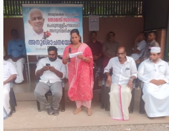 പുതുപ്പാടി: മൂന്ന് പതിറ്റാണ്ട് കാലം തലമുറകൾക്ക്അക്ഷരവെളിച്ചം പകർന്ന നാടിന്റെ പ്രിയങ്കരനായതോമസ് മാസ്റ്ററുടെ വിയോഗത്തിൽ പെരുമ്പള്ളി പൗരാവലി അനുശോചിച്ചു. പുതുപ്പാടി ഗ്രാമപഞ്ചായത്ത് മെമ്പർ ബ്രിജിലസുനീഷ് അധ്യക്ഷം വഹിച്ച ചടങ്ങിൽ ബിജു തോമസ് അനുശോചനപ്രമേയം അവതരിപ്പിച്ചു.എം മുഹമ്മദ് സ്വാഗതം ആശംസിച്ചു. ടി സി വാസു,പി പി അബ്ദുൽമജീദ്,എം കെ ജാസിൽ,ഉമർമുസ്ലിയാർ,ജോണി കെ ജെ,എ പി രാജൻ,എം എ ഖാദർമാസ്റ്റർ,എം മുസ്തഫ,എൻ അഹമ്മദ് കുട്ടി എന്നിവർ അനുശോചിച്ചു.